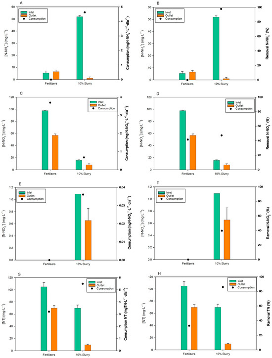 The initial and final N-NO2− values and consumption were also measured (Figure 6E). The removal was 0% in cultures with fertilizers and 39.7% in cultures with 10% slurry (Figure 6F). Fertilizers and 10% slurry treatments showed statistically significant differences related to N-NO2− consumption and removal percentage (p < 0.05). Finally, the initial and final TN of both treatments were determined. The initial TN was 105.1 ± 7.1 mg·L−1 and 85.1 ± 5.2 mg·L−1 using fertilizers and 10% slurry, respectively. The final TN in the output water was 70.2 ± 4.5 mg·L−1 and 10 ± 0.6 mg·L−1, respectively. These values imply a consumption of 3.2 mg·L−1 and 5.5 mg·L−1, respectively (Figure 6G). The TN removal percentages were 33.3% and 85.7% using chemical fertilizers and 10% slurry as the culture medium, respectively (Figure 6H). Statistically significant differences were observed between both treatments related to TN consumption and removal (p < 0.05).