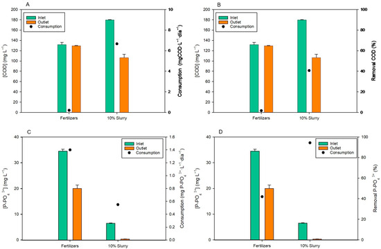 Regarding P-PO4−3, the initial concentrations were 34.5 ± 0.8 mg·L−1 and 6.5 ± 0.1 mg·L−1 using fertilizers and 10% slurry, respectively. After biomass separation, the P-PO4−3 concentration in the output water was 20 ± 1.1 mg·L−1 in the cultures with fertilizers as the culture medium and 0.36 ± 0.01 mg·L−1 in the cultures with 10% slurry as the culture medium. Thus, the consumption was 1.3 ± 0.1 mg·L−1·day−1 and 0.56 ± 0.03 mg·L−1·day−1 in the cultures with fertilizers and 10% slurry, respectively (Figure 7C). In turn, the removal percentage was 42% in the cultures with fertilizers and 95% in the cultures with 10% slurry (Figure 7D). Statistically significant differences were observed between treatments with fertilizers and 10% slurry related to P-PO4−3 consumption and removal (p < 0.05).