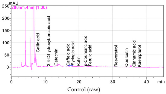 The phenolic constituent quantities of raw and roasted carob powders are defined in Table 2. Gallic acid, 3,4-dihydroxybenzoic acid, catechin, rutin and ferulic acid were established to be at the highest quantities in raw and roasted carob powders (Figure 1). While gallic acid values of the carob powders were assigned to be between 45.16 (control) and 120.66 mg/100 g (150 °C), 3,4-dihydroxybenzoic acid values of the carob powders were assigned to be between 7.06 (control) and 20.46 mg/100 g (150 °C). Catechin and caffeic acid quantities of the raw and roasted carob powders were characterized to be between 13.65 (control) and 68.86 (150 °C) to 2.56 (control) and 18.67 mg/100 g (120 °C), respectively. Syringic acid and rutin quantities of the carob powder samples were specified to be between 1.95 (90 °C) and 33.47 (120 °C) to 16.79 (control) and 39.63 mg/100 g (150 °C), respectively. While p-coumaric acid quantities of the carob powders vary between 2.58 (control) and 8.99 mg/100 g (150 °C), ferulic acid quantities of the raw and roasted carob powders were identified to be between 4.19 (90 °C) and 10.25 mg/100 g (150 °C). Resveratrol and quercetin quantities of raw and roasted carob powders were found to be between 0.35 (control) and 2.63 mg/100 g (90 °C) to 0.83 (control) and 6.27 mg/100 g (120 °C), respectively. Since quercetin is a flavonoid, it has an antioxidant effect. However, since resveratrol is a non-flavonoid polyphenol belonging to the stilbenoid group, its antioxidant effect may be quite low. Also, cinnamic acid values of the carob powders were established to be between 1.29 (150 °C) and 2.32 mg/100 g (120 °C). Kaempferol quantities of raw and roasted carob powder samples were established to be under <0.54 mg/100 g (120 °C). It was observed that there were statistically significant differences among phenolic constituent amounts of raw (unroasted) carob powder and carob powder roasted at different temperatures (p < 0.05).