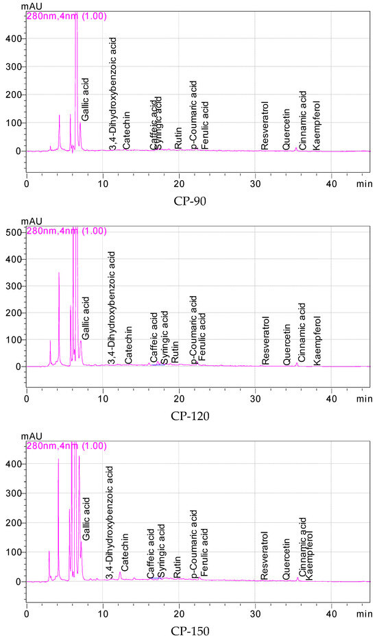 Phenolic chromatograms of raw (control) and roasted (CP-90, CP-120, CP-150 °C) carob powders.