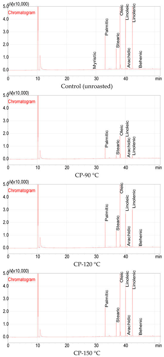 Fatty acid chromatograms of raw (control) and roasted (at CP-90, CP-120 and CP-150 °C) carob powder oils.