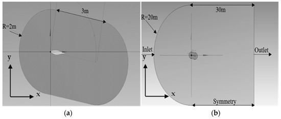 To determine the power output of a certain wind turbine, it is crucial to comprehend the aerodynamic principles of airfoils. The input parameters of the NREL S809 airfoil are tabulated in Table 1. To study the NREL S809 airfoil, two domains were designed (inner and outer domains) as shown in Figure 3. The purpose of an inner domain around the airfoil is to densify higher grid resolutions and turns according to the designated angle of attack to maintain the meshing concentration between the inner domain and the airfoil. On the other hand, the outer domain is meant to have a radius of 20 m and a length of 30 m.