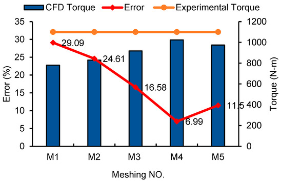 Additionally, the error percentage was calculated by comparing the simulated torque values with the experimental torque value of 1100 N-m [35]. Table 4 presents a comprehensive analysis of the mesh configurations, including the number of cells, torque predictions, and error percentages in relation to the experimental torque of 1100 N-m. The mesh with the finest resolution, M4, consisting of 13.027 million cells, exhibits the lowest error rate of 6.99%. In contrast, coarser meshes such as M1 and M2 yield significantly higher error rates of 29.09% and 24.61%, respectively. This highlights the significance of mesh refinement in attaining dependable and accurate computational fluid dynamics (CFD) forecasts, especially in accurately representing aerodynamic forces. The results validate that the density of the mesh is crucial in determining the accuracy of computational fluid dynamics (CFD) simulations. Despite the increased computational costs, the use of finer meshes, specifically M4 and M5, is justified by their enhanced accuracy in predicting torque. In order to achieve precise evaluations of wind turbine aerodynamic performance, it is imperative to use meticulously developed meshes. This ensures that the simulation results closely match the experimental data, thereby increasing the study’s reliability.