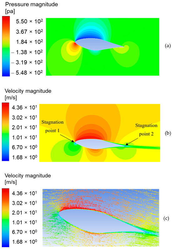 S809 airfoil simulation contours: (a) Pressure contour; (b) velocity contour; (c) airflow vectors.