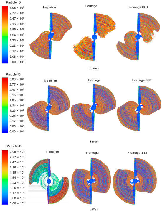 The NREL Phase VI rotor was used to simulate three-dimensional flow at wind speeds of range (6–10 m/s). The simulation employed the k-epsilon, k-omega, and k-omega SST turbulence models, as shown in Figure 10, to generate particle pathlines. The particle pathlines illustrate the paths taken by airflow particles as they circulate around the rotor blades, providing a distinct visualisation of the aerodynamic behaviour in various flow conditions. The pathlines illustrate the intricate interplay between the airflow and the rotor surface, emphasising regions of flow detachment and reattachment in response to variations in wind speed. Particles ID in ANSYS refers to the unique identifiers for individual particles being tracked in the simulation, allowing the user to follow their specific trajectories and analyse their behaviour within the flow field where colours and their respected values are representing the number of the particle’s identifiers. High particle IDs do not indicate better or worse performance, but allow for detailed visualization of the flow behaviour over time, helping to analyse specific flow features around the rotor blades.