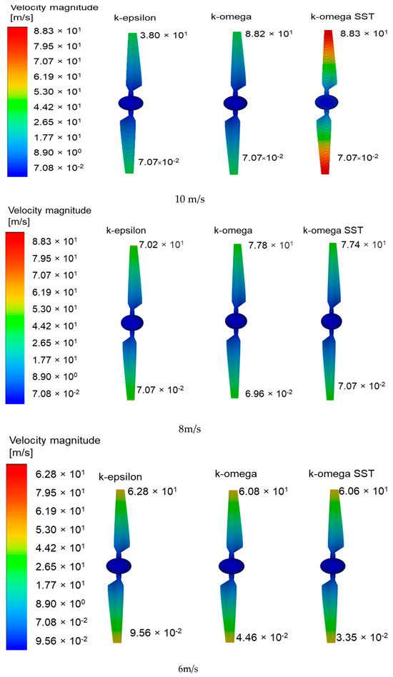 Figure 11 exhibits the simulation contours of the magnitude of velocity for the NREL Phase VI rotor at wind speeds of 10 m/s, 8 m/s, and 6 m/s, employing different turbulence models. The highest magnitude of velocity reaches 8.83 × 10 m/s, primarily at the edges of the blades, where the airflow speeds up because of rotational effects and influence. Conversely, the minimum velocity of 9.56 × 10−3 m/s is detected in close proximity to the rotor hub and in areas characterised by stagnation or recirculation, where the flow experiences a notable decrease in speed. The extreme values observed in this case represent the aerodynamic characteristics along the entire span of the rotor. High velocities at the blade tips indicate efficient energy extraction, while low velocities near the centre of the rotor suggest flow inefficiencies.