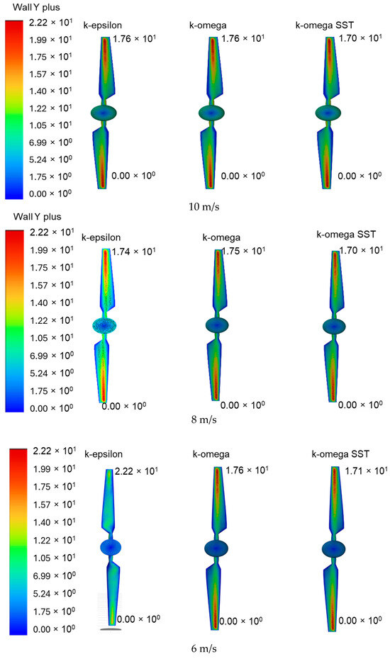 NREL phase VI rotor simulation contours of wall Y+ for 10, 8, and 6 m/s wind velocities at various turbulence models.