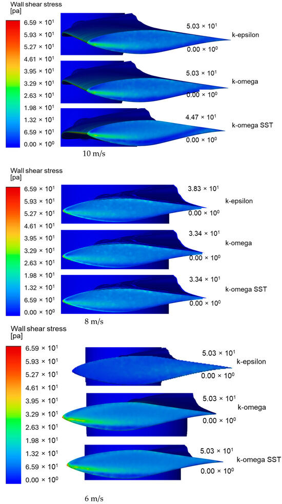 NREL phase VI rotor simulation contours of wall shear stress for 10, 8, and 6 m/s wind velocities at various turbulence models.