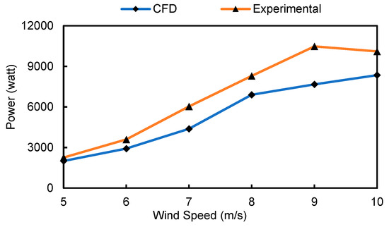 Table 6 compares the torque values predicted by various CFD simulations with experimental torque measurements for the NREL Phase VI rotor across different wind speeds, revealing that the maximum torque predictions closely match experimental results, while minimum torque values show slight deviations, particularly at lower speeds. These discrepancies highlight the challenges faced by turbulence models in accurately capturing flow separation and complex aerodynamic behaviour. In parallel, Table 7 validates the average CFD torque and power outputs against experimental data, showing that the maximum power outputs at higher wind speeds are consistent with the experimental results, indicating reliable energy conversion predictions. However, minor differences in the minimum power outputs at lower speeds reflect the sensitivity of the turbulence models to flow behaviour under varying conditions. Regarding the change of values when comparing Table 6 and Table 7, k-omega SST theoretically should perform better as it combines k-omega and k-epsilon turbulence models advantages in predicting the flow regardless of its distance from the wall, yet in this case, it requires higher wind velocity than 10 m/s to initiate the separation of flow and in counts the shear stress transients. Despite these variations, the overall agreement between the CFD predictions and experimental data confirms that the models perform within acceptable accuracy ranges for both torque and power outputs. In addition, the power coefficient Cp on the other hand is defined by Equation (10) which is how efficiently a turbine converts the energy in the wind to electricity. From Table 7, the highest achieved Cp was at 5 m/s wind speed with 0.37 at the experimental method. In terms of power outputs, Figure 15 shows simulated and experimental wind turbine power output. Moreover, torque values in Table 7 have been calculated by obtaining the average torque value of the three predicted turbulence models for each wind speed.