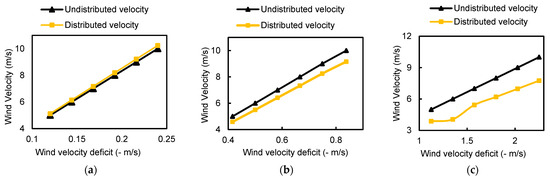 Comparison in wake effect using Gaussian wake assessment model in terms of wind velocity (distributed and undistributed) and wind velocity deficit at various distances (x): (a) At (x = 30 m); (b) At (x = 50 m); (c) At (x = 75 m).