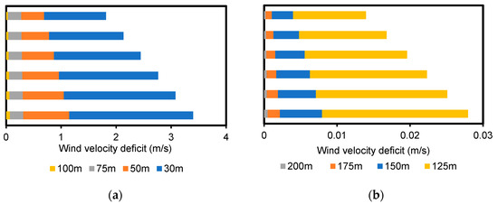 Comparison in wake effect using Gaussian wake assessment model for wind velocity deficit at various distances (x): (a) At (x = 30 m to x = 100 m); (b) At (x = 125 m to x = 200 m).