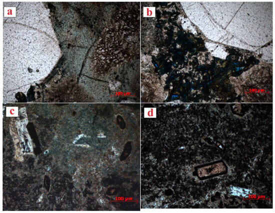 Microscopic photograph of the samples. (a,b) is a rhyolite–type crystal tuff from well CS1 that mainly composed of plagioclase, quartz, and a small amount of volcanic ash, with locally pronounced erosion; (c,d) is crystalline tuff W21, mainly composed of plagioclase, quartz, and a large amount of volcanic ash, with significant dissolution pores and sericite alteration in the grains.