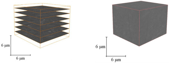 Noise in the original grayscale image was removed by filtering. All scanned slices were imported into Avizo image processing software, where the median filter algorithm was employed to denoise the fuzzy regions, thereby enhancing the image resolution. Following noise reduction, the image revealed a matrix, mineral particles (rock skeleton), and micro–nano scale pores. Avizo image segmentation technology in combination with the top cap method was used to fully segment the pores within the grayscale image and encircle the rock skeleton, thereby capturing all pores present in the slice images. Following processing, all 2D grayscale slices were integrated into a 3D micro–nano scale digital core model [69] (Figure 4). This process enabled the precise extraction of total pores within the volcanic reservoir core samples, serving as the foundational data model for the subsequent development of the total pore distribution model, connected pore segmentation model, pore–throat network model, fracture model, and natural gas seepage simulation.