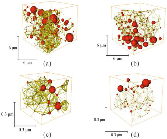 Pore–throat network. The red ball represents pores and yellow tubes represent throats. It shows a contrast in pore–throat configurations between the CS1 and W21 samples (micro–CT: (a)—CS1, (b)—W21; nano–CT: (c)—CS1, (d)—W21).