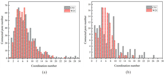 Coordination frequency distribution of samples showing the connectivity between the pores of CS1 and W21 (micro–CT: (a); nano–CT: (b)).
