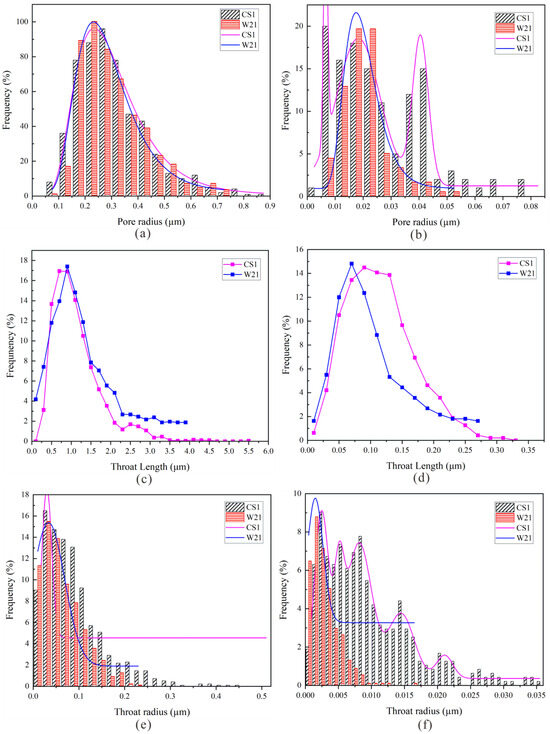 The frequency distribution histogram shows pore radius, throat length, and throat radius in CS1 and W21 samples (micro–CT: (a,c,e); nano–CT: (b,d,f)).