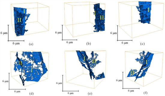 3D fracture body model shows the extension shape of the fractures from different angles. I and II are the main fractures of CS1 and W21, respectively (micro–CT: (a–c)—CS1; (d–f)—W21).