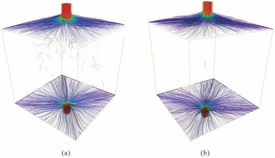 A natural gas seepage simulation was conducted based on a pore–throat network model. The upper end is the entrance and the lower end is the exit. The length, width, and streamline count were employed to characterize the trajectory of natural gas seepage within a volcanic reservoir. In the microscale CS1 sample, a higher concentration of streamlines was readily observed in the central area, which was notably thicker and longer than those in other areas, indicating superior permeability conditions (Figure 13a). However, the W21 sample exhibited a reduced total number of streamlines, with the majority being thin, short, and challenging to detect (Figure 13b). The seepage yielded flow rates for the CS1 and W21 samples of 3.19 × 10−6 cm2/s and 0.77 × 10−6 cm2/s, respectively, with corresponding permeabilities of 0.129 md and 0.030 md.