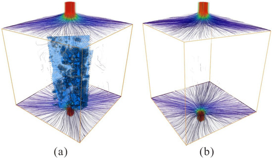 Natural gas seepage simulation. The streamline represents the seepage path of CH4 in cores of the CS1 and W21 samples (micro–CT: (a)—CS1; (b)—W21).