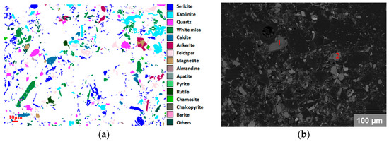 SEM photos of flotation feed: (a) identification of mineral classification; (b) gray-scale map.