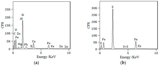 A scanning electron microscope photo of the feed coal slime is shown in Figure 1. According to Figure 1a, the feed coal contained many gangue particles with the main ingredients including sericite, kaolinite, quartz, white mica, and other substances. These particles resulted in a high ash content of raw materials. Consequently, the fine coal should be beneficiated before being used for blast furnace injection. Moreover, many gangue particles had a particle size of less than 0.05 mm. The particle size was relatively small. This follows the results of the particle size composition analysis in Table 1. Fine gangue particles, namely high-ash fine slime, significantly impact the flotation process. These particles adsorb reagents and easily cover the surfaces of bubbles and coal particles due to their large specific surface area, resulting in the loss of coarse clean coal into the tailings. Furthermore, the rising bubble group is likely to cause the mechanical entrainment of fine gangue particles, increasing the ash content in the clean coal. However, during the industrial production process, using mechanically agitated flotation machines, the ash contents in the clean coal and tailings were both relatively low, indicating that the clean coal had a certain loss. This was likely due to the relatively high ash content of low-density particles in the feed. These particles contain a certain number of coal particles and gangue-associated bodies. When the gangue accounts for a large proportion of the associated bodies, these particles are easily mismatched into the tailings. Figure 1b shows a scanning electron microscope photo magnified 500 times. Two points were selected, and the energy spectra of the two particles were analyzed. The results are shown in Figure 2. The main components of gangue particle 1 were oxides of Si, Al, Fe, and Ca. Furthermore, this particle contained small amounts of 0.4% K, 0.19% Mg, 3.81% Zn, and 5.4% Pb elements. The main component of gangue particle 2 was pyrite.
