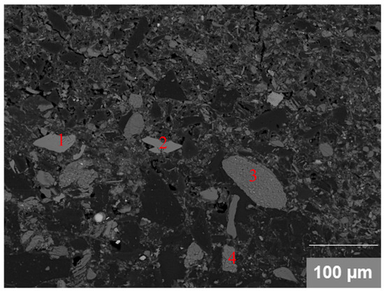 The scanning electron microscope photo of the tailings particles is shown in Figure 3. The tailings contained many gangue particles. This indicates that the gangue particles were greatly enriched after flotation. The ash content of the tailings obtained under optimized experimental conditions was also relatively high, reaching 53.13%. The elemental composition of the gangue particles is shown in Table 2. The main component of gangue particle 1 was iron oxide, with a high Fe content of 63.05%. The main component of gangue particles 2 and 3 was limestone, with Ca contents of 41.39% and 38.35%, respectively. The main components of gangue particle 4 were quartz and alumina, with Si and Al contents of 19.66% and 17.81%, respectively.