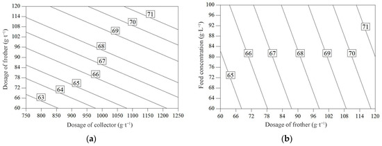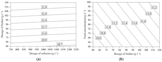 ANOVA was conducted on these two models, as shown in Table 3 and Table 4, respectively. The F-values of the two models were 7.46 and 5.68, respectively. The p-values were both less than 0.005, indicating that the predicted models had a probability of less than 0.5% to reach the F-values. Therefore, these two models are significant and have high credibility for predicting the clean coal yield and clean coal ash content. In addition, the p-values of the collector and frother dosages were both less than 0.03 in the variance analysis of the prediction model for clean coal yield, indicating a significant effect on the clean coal yield. The p-value of the frother dosage was less than 0.002 in the variance analysis of the prediction model for clean coal ash, which significantly impacted the ash content in the clean coal. The effects of the feed concentration on the yield and the ash content in the clean coal were insignificant within the feed concentration range in this study.