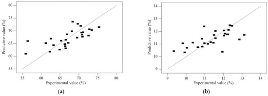 Comparison between experimental values and predicted values: (a) clean coal yield; (b) clean coal ash.