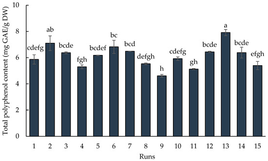 Total polyphenol content (TPC) expressed in milligrams of gallic acid equivalent (GAE) per gram of dry weight (DW) of microwave-assisted extracts from Agave lechuguilla guishe. Distinct letters indicated a significant difference (Tukey, p-value < 0.05).