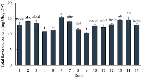 Total flavonoid content expressed in milligrams of quercetin equivalent (QE) per gram of dry weight (DW) of microwave-assisted extracts from Agave lechuguilla guishe. Distinct letters indicated a significant difference (Tukey, p-value < 0.05).