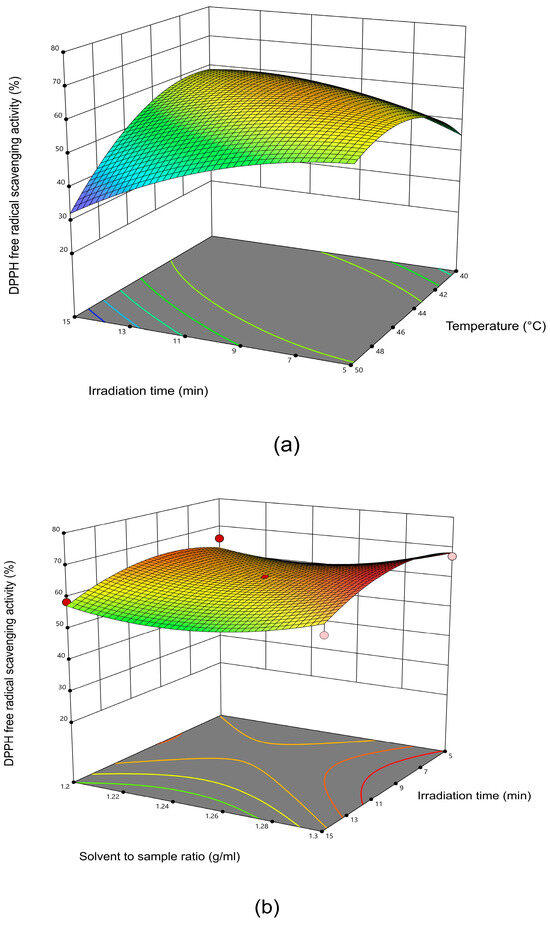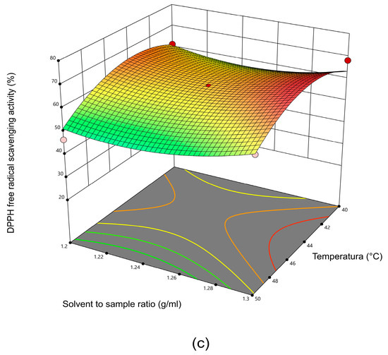 Figure 3 shows the effects of irradiation time, temperature, and solvent: sample ratio on DPPH• free radical scavenging activity. Figure 3a shows that DPPH• free radical scavenging activity was increased with high temperatures and irradiation time, with a decrease in antioxidant activity with increasing temperature and irradiation time greater than 45 °C and 8 min, respectively. The effects of solvent: sample ratio and irradiation time of the DPPH• free radical scavenging activity were shown in Figure 3b, an increase in DPPH free radical scavenging activity at an irradiation time of 8 min and solvent to sample ratio of 1:30 m/v, with a decrease as irradiation time increases at a fixed temperature (45 °C). Finally, Figure 3c shows a higher DPPH• free radical scavenging activity at a temperature of 45 °C with a decrease as temperature increases, a solvent-to-sample ratio of 1:30 m/v at a fixed irradiation time. Increasing the mass-to-volume ratio can increase DPPH• activity by flavonoids in the extracts.