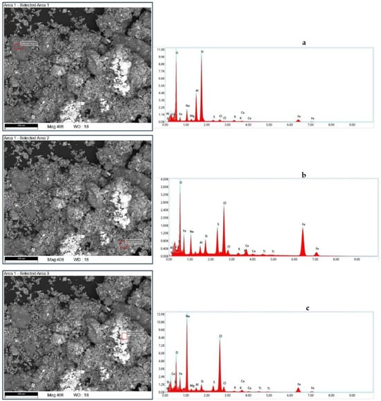 The process of cleaning the tank oil sludge from container impurities was carried out by vacuum filtration. Figure 3 shows images of the mechanical particles obtained using a microscope scan and elementary analysis. Figure 3a shows the surface of the mechanical particles. Figure 3b,c show the morphological structure of harder particles.
