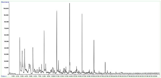 Table 6 presents the results of distillation of oil sludge from tank No. 1. Sample No. 2 of tank oil sludge was treated with ultrasound after mixing with a solvent. It has been established that oil sludge is a multicomponent mixture consisting of paraffin-naphthenic series substances and aromatic hydrocarbons, the intense peaks of which appear with a release time from 3 to 16 min (Figure 6).