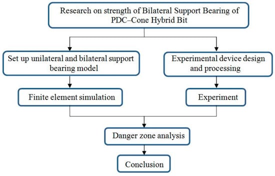 In order to further improve the service life of the hybrid bit, this paper creatively proposes a design structure for a bilateral support bearing based on the analysis of bearing failure mechanisms. It is a prototype of an ordinary PDC–cone compound drill bit. The bearing structure is studied through simulation and experiments, and the stress distribution diagrams and strains of the bearing in three dangerous areas are obtained. The results of experiments and FEA (finite element analysis) show that compared with the single-sided support structure, the two-sided support structure should have less stress change and a longer life. The graphical abstract is shown in Figure 2.
