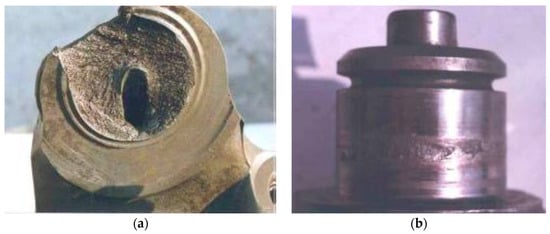 At present, the main failure forms of bearings include the following aspects: (1) fracture failure, due to the drilling pressure of the bearing being very large, in addition to a coordination gap between the bearing and the cone, and the vibration producing its force differently during work, as well as some local loads being larger, mainly at the smallest diameter (Figure 3a); (2) wear failure, including adhesive wear and abrasive wear (mainly adhesive wear), and seal failure accompanied by abrasive wear (Figure 3b) [14,15,16,17,18,19,20,21].
