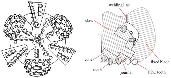 The cutting structure of the PDC (polycrystalline diamond compact)–cone hybrid bit is composed of a fixed PDC cutting structure and a cone cutting structure (Figure 1). Because of the characteristics of the two cutting structures, the PDC–cone hybrid bit is mainly used in the following special situations: (1) The development of conventional reservoirs can no longer meet the needs of social development, and the development of deep unconventional reservoirs has been put on the agenda [1,2]. The largest well depth in Xinjiang and Sichuan region of China has exceeded 10,000 m. Due to the difficulty of deep formation drilling, a single PDC bit cannot effectively break rocks. (2) For directional wells and horizontal wells, the tool face of a PDC bit is unstable, and the torque fluctuates greatly, resulting in poor control of the well trajectory. (3) When facing a heterogeneous formation containing gravels, etc., with the PDC bit, it is easy to break the teeth, resulting in bit failure. (4) With a hard formation, the PDC bit teeth wear faster, and the mechanical penetration rate of the cone bit is too low [3,4,5,6,7,8,9].