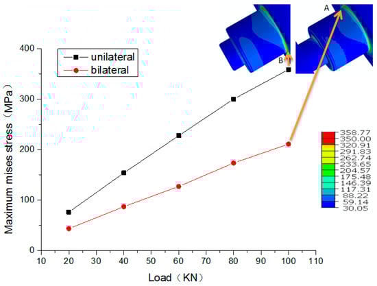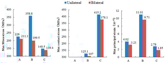 The Mises stress, contact stress, and principal strain in the A, B, and C zones at a maximum of 100 kN were selected for analysis (see Table 3 and Figure 11). From Table 3 and Figure 11, it can be found that compared with unilateral supported bearings: (1) The maximum Mises stress area of bilateral bearing changed from zone B to zone A, decreasing from 358.80 MPa to 211.10 MPa, a decrease of 41.16%, and the stress difference of the AB zone decreased from 132.80 MPa to 11.6 MPa. (2) The maximum contact stress in the C zone decreased from 415.20 MPa to 378.10 MPa, a decrease of 8.94%. (3) The maximum principal strain in zone B decreased from 1.101 × 10−3 to 9.71 × 10−4, a decrease of 11.81%.