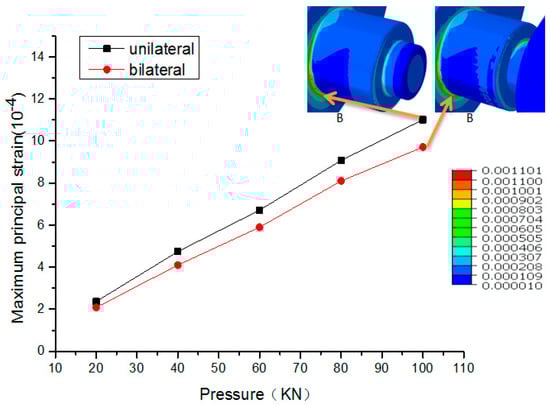 It can be seen from Figure 8 that the maximum Mises stress of the unilateral supported bearings is in the B zone of the bearing, while that of the bilateral supported bearings is in zone A, and the maximum Mises stress of the bilateral supported bearings is far less than that of the unilateral supported bearings. It can be seen from Figure 9 that the maximum contact stress of the unilateral and bilateral supported bearings is in zone C of the bearing, and the maximum contact stress of the bilateral supported bearings is smaller than that of the unilateral supported bearings. It can be seen from Figure 10 that the maximum principal strain of the unilateral and bilateral supported bearings is in zone B of the bearing, and the maximum principal strain of the bilateral supported bearings is smaller than that of the unilateral supported bearings. The maximum Mises stress, maximum contact stress, and maximum principal strain were all linearly positive correlated with the pressure.