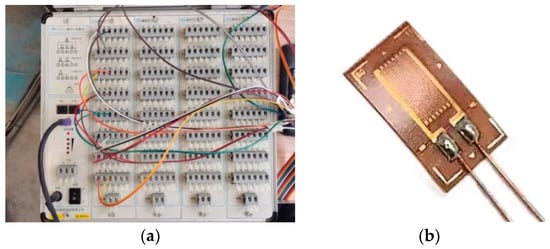 The strain acquisition system adopts the JM5951 strain acquisition instrument (Figure 15a), which supports static and low-speed dynamic strain, voltage, and IEPE tests. The sensor adopts a 120-3AA strain gauge (Figure 15b), which is characterized by high sensitivity and stability. The loading system and strain collection instrument are connected to the computer terminal.