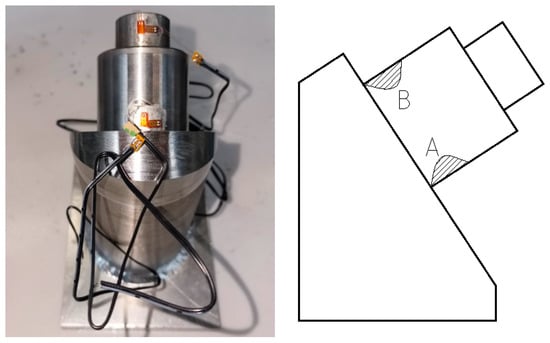 Bearings deform under pressure loading, and the strain of the bearing can be measured by the strain gauge on its surface. The strain gauge is mounted along the axial direction at the upper and lower parts of the two end faces of the large journal and numbered A and B (as shown in Figure 16). The contact between the cone and the pressure plate in zone C cannot accomodate holes for attaching the strain gauge, which is not analyzed in this experiment, and the small circumferential strain can be ignored. The numbered strain gauge is connected to the corresponding interface of the strain acquisition instrument.