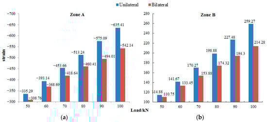 Comparison of zone A and B strains of unilateral and bilateral support structure: (a) zone A strains; (b) zone B strains.