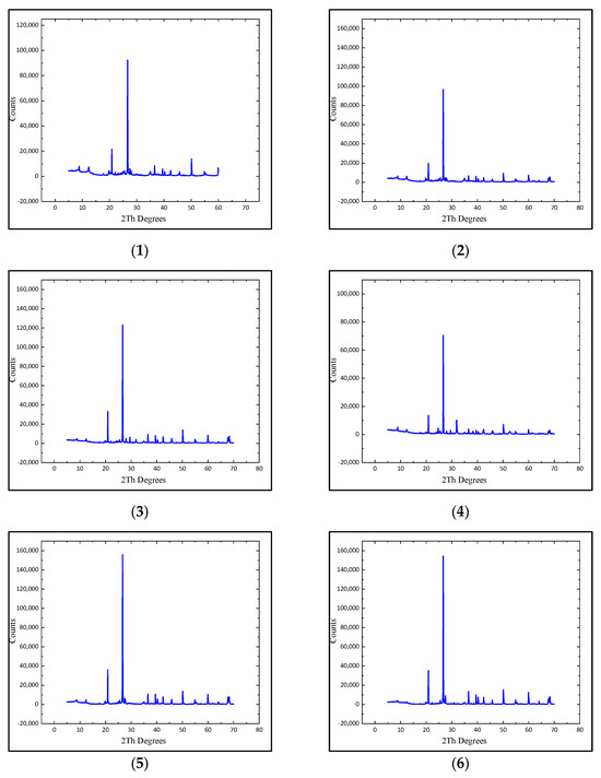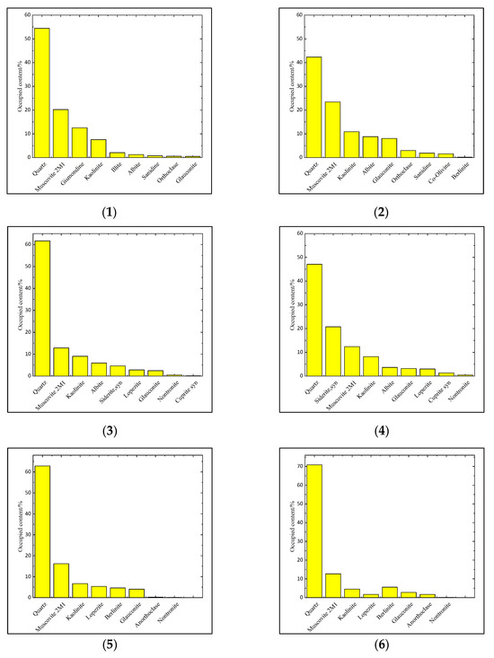 Figure 4 shows the X-ray diffraction results for the six groups of samples. The sequence number in the upper-left corner of Figure 4 is a map of each corresponding sample. By considering the position, intensity, and shape of the diffraction peaks of each sample, the whole-rock quantitative analysis was carried out.