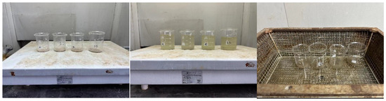 The four groups of samples were placed in different beakers, and 10 mL H2O2 with a concentration of 10% was added and heated on an electric heating plate. During the heating process, the wall of the burning cup was continuously washed with washing solution, and the paper foam disappeared. Another 10 mL of HCL at 10% concentration was added to the sample to remove the calcium gel substance contained in the sample. Water was added to the sample and stirred to neutralize and clean the calcium and chloride ions. After adding 10 mL of sodium hexametaphosphate (NaPO3)6 solution with a concentration of 1 mol/L, the sample was fully dispersed. Finally, the sample was cleaned using a KQ-500E ultrasonic cleaner (made in Xi’an, China).