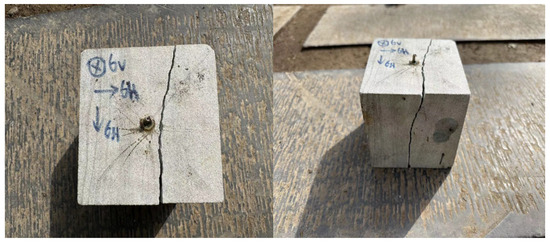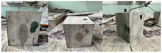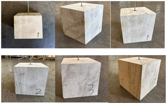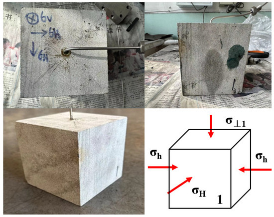 In this experiment, according to the lithology, compressive strength, and porosity of the target reservoir, a similar rock was selected as the sample for a true triaxial rock mechanics physical simulation experiment of water injection dilation. The cube sample of 100 mm was made of rock, and the samples were marked as 1, 2, and 3. Holes of diameter 5 mm and depth of 55 mm were removed at the center of the top surface of the samples, and a metal pipe was inserted in the hole and sealed with glue. Samples 1, 2, and 3 are shown in Figure 9.