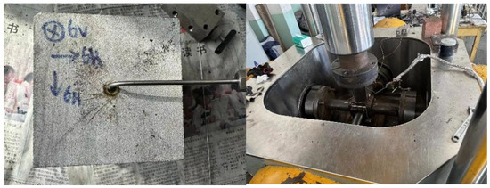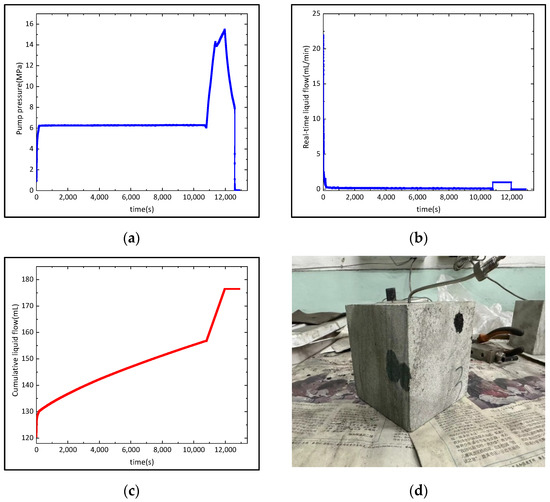 The top surface was judged according to the position of the water injection pipe, the vertical stress was applied to the top surface and the ground, and the directions of the horizontal maximum principal stress and horizontal minimum principal stress were selected. Glue was applied to the surface of the sample to connect the sample with the surface of the iron block. The displacement of the true triaxial mechanical machine pipe was controlled by the motor to control the pressure loaded by the machine on all sides of the sample. The pump pumped the liquid into the sample at a constant flow rate through the pipe. To ensure an appropriate liquid temperature, the liquid in the pump was electrically heated, and the peripheries of the pump and the pipe were wrapped with insulation. The sample and experimental equipment during water injection are shown in Figure 10.