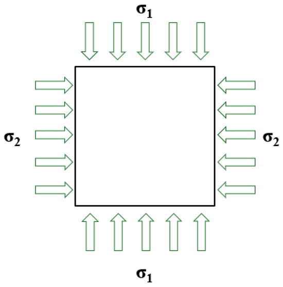 The true triaxial test can use either strain control or stress control, each of which has its own characteristics and advantages. The stress conditions of true triaxial experiments are shown in Figure 8. Under the strain control mode, the strain of the sample is uniform, the strain can be measured accurately, and the complex stress–strain path can be simulated. Under the stress control mode, the principal stress acts on the loading surface in the normal direction, and the stress distribution on each surface is uniform. This can achieve maximum strain without obvious boundary interference, which is easy to test according to the predetermined complex stress path.