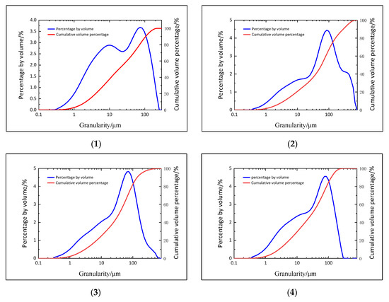 Percentage by volume (blue) and cumulative volume percentage (red) of (1) sample #1, (2) sample #2, (3) sample #3, and (4) sample #4.