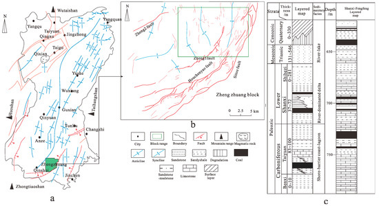 The comprehensive histogram of structural geology and strata in the Zhengbei block. (a) tectonic geological map of Qinshui Basin; (b) structural geological map of northern Zhengzhuang; (c) northern Zhengzhuang stratigraphic histogram.