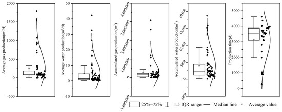 Box diagram of gas and water production characteristics of No. 3 coal seam CBM wells in the Zhengbei block. The black rombs representative data points and lines indicate that the data obey the normal distribution law.