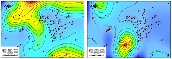 It is found that the average gas production of CBM wells is low, 80% of the wells are less than 500 m3/d, and there are few wells more than 1000 m3/d according to the drainage data of 75 CBM wells in the Zhengbei block. The water production is mostly concentrated at about 4 m3/d, and the local level is higher than 20 m3/d. The drainage time of CBM wells in the block is longer, and 64% of the wells have a drainage time of more than 10 years (Figure 2). The average gas production and cumulative gas production of coal seam drainage wells in the study area are mainly analyzed. The average gas production is between 0 and 1793 m3/d, with an average of 250.97 m3/d; the cumulative gas production ranges from 0 to 3,072,182 m3, with an average of 254,264.67 m3. The highest points of average gas production and cumulative gas production are mainly concentrated in the northern, central, and southeastern parts of the block, and the rest are low (Figure 3).